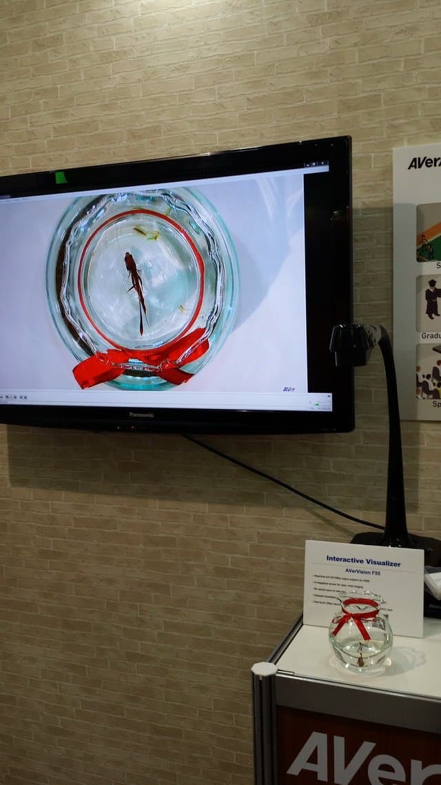 Класс устройств, предназначенных для проведения видеопрезентаций, был представлен на стенде AverMedia несколькими аппаратами с похожим назначением, но разной функциональностью. Например, типичный слайд-проектор, функциональность которого заключается в съемке и трансляции изображения с бумажных и прочих носителей, расположенных горизонтально под камерой. Вроде быстрого сканера с высоким разрешением, который выводит картинку на монитор или проектор. Такой вот симпатичный «интерактивный визуализатор», который на стенде был занят демонстрацией рыбки.