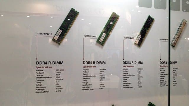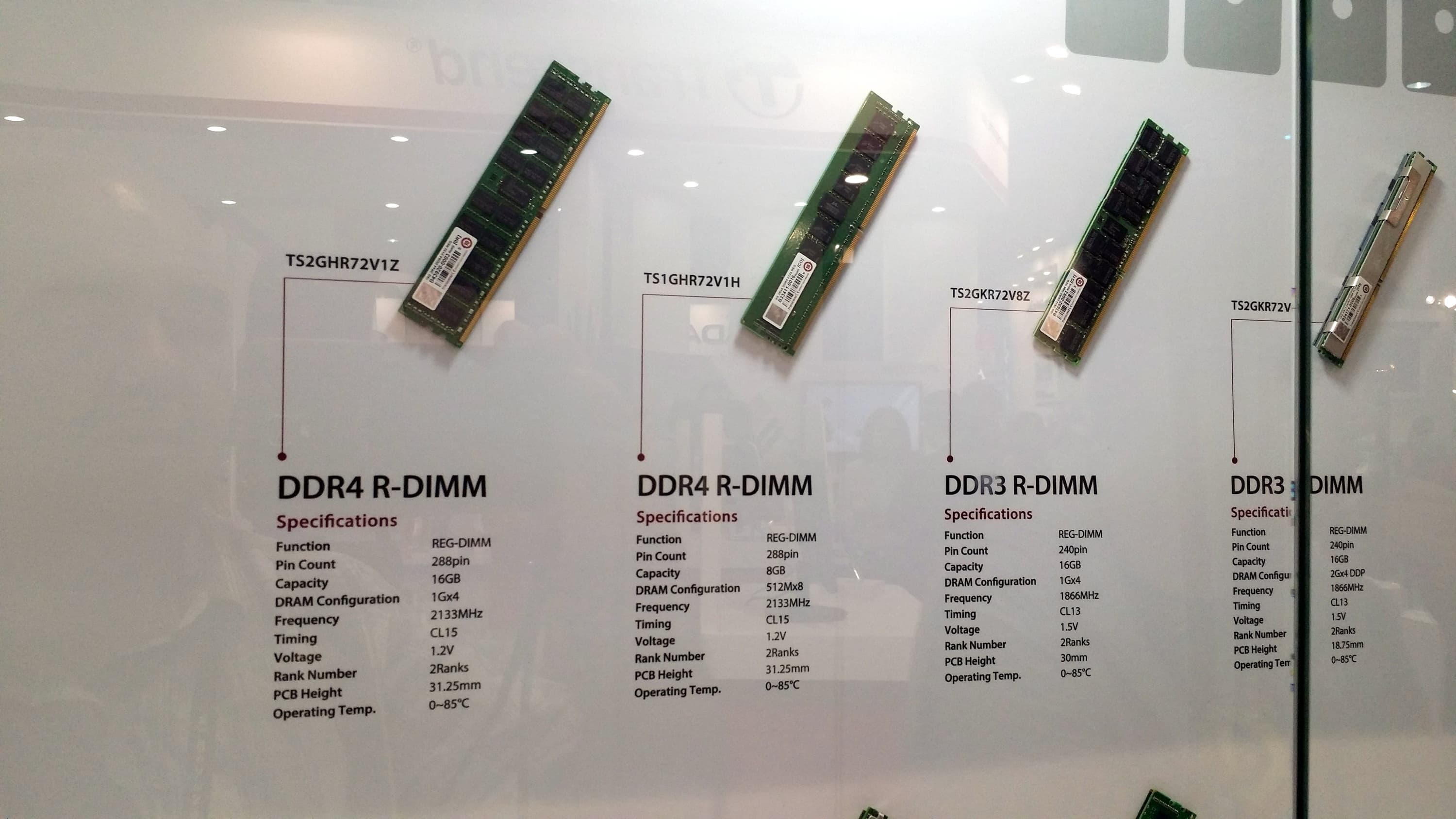 Конечно же, Transcend — это и крупный производитель модулей оперативной памяти для ПК (и индустриальных нужд). На стенде представлены все новейшие DIMM-решения, включая самую современную память типа DDR4. Эти модули пока еще на тестах, серийное производство начнется чуть позже, но эксперты уже ожидают прирост по скорости работы с памятью до 50% относительно DDR3. Стартовая частота DDR4-модуля 2133 МГц, а через полгода-год обещают достичь 3200 МГц.