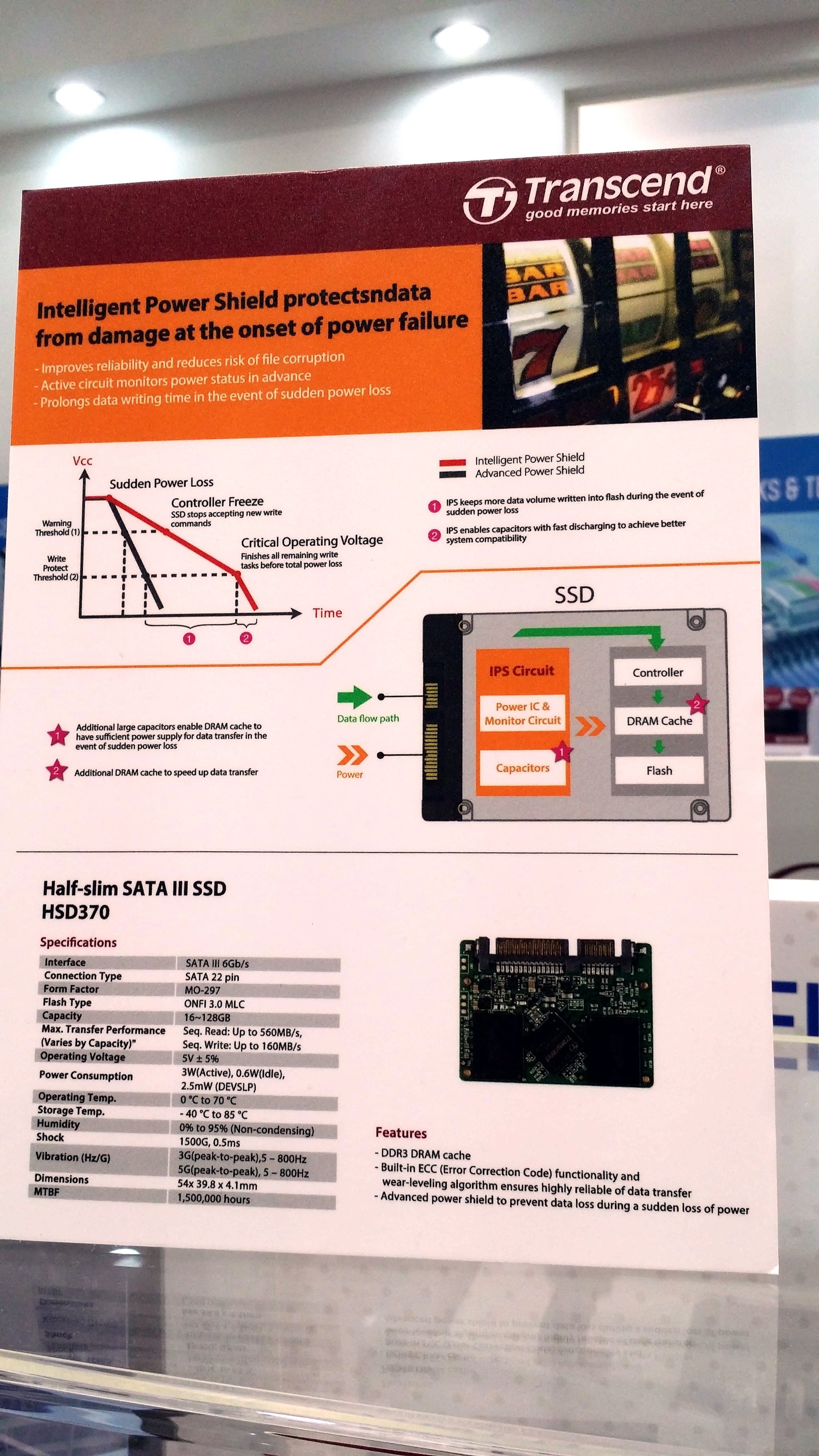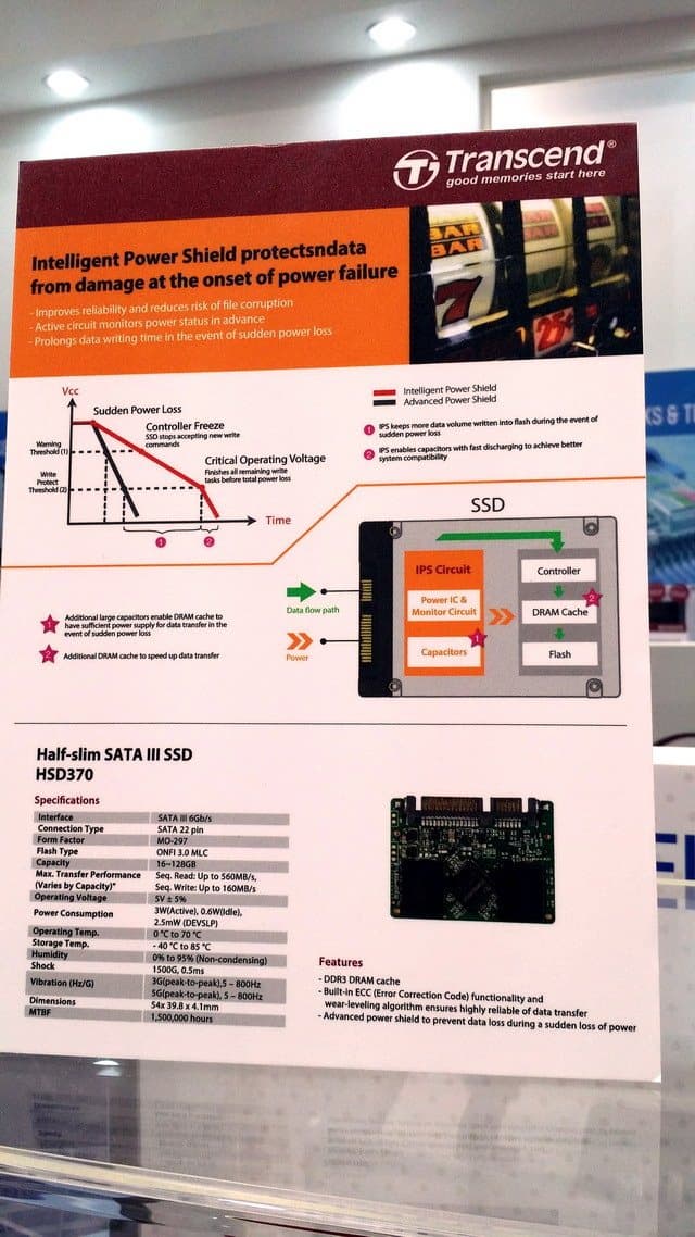 Компания Transcend разработала и уже широко внедряет систему защиты содержимого накопителя при резком падении электропитания — Advanced Power Shield (APS). У APS есть два порога напряжения. Не секрет, что из-за инертности блоков питания падение напряжения на питаемых ими устройствах происходит не мгновенно, а по наклонной кривой. Поэтому есть некоторое время для того, чтобы провести определенные операции по сохранению данных. При падении вольтажа ниже первого порога посылается сигнал контроллеру на прекращение приема новых данных на накопитель. Моментально закрываются все открытые задачи по записи. При падении вольтажа ниже второго порога включается режим защиты от записи на случай несрабатывания предыдущего действия со стороны контроллера. Теперь же введена в действие вторая ступень системы защиты — Intelligent Power Shield (IPS). Увеличены временные интервалы для завершения работы накопителя (что позволяет максимально безопасно завершить все операции записи).