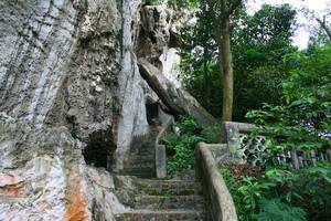После первого этапа, когда уже лестница вышла из пещеры наружу, стало понятно, что подниматься очень и очень непросто: ступени подчас становятся настолько узкими, что ногу можно поставить только вдоль ступеньки, плюс покрытие мхом, делающее ступени весьма скользкими. Перила есть, но они часто внезапно меняют свое местоположение из-за особенностей рельефа, и потому приходится подчас тянуться, перехватывая руками от перила к перилу, чтобы четко закрепиться на ступенях.
