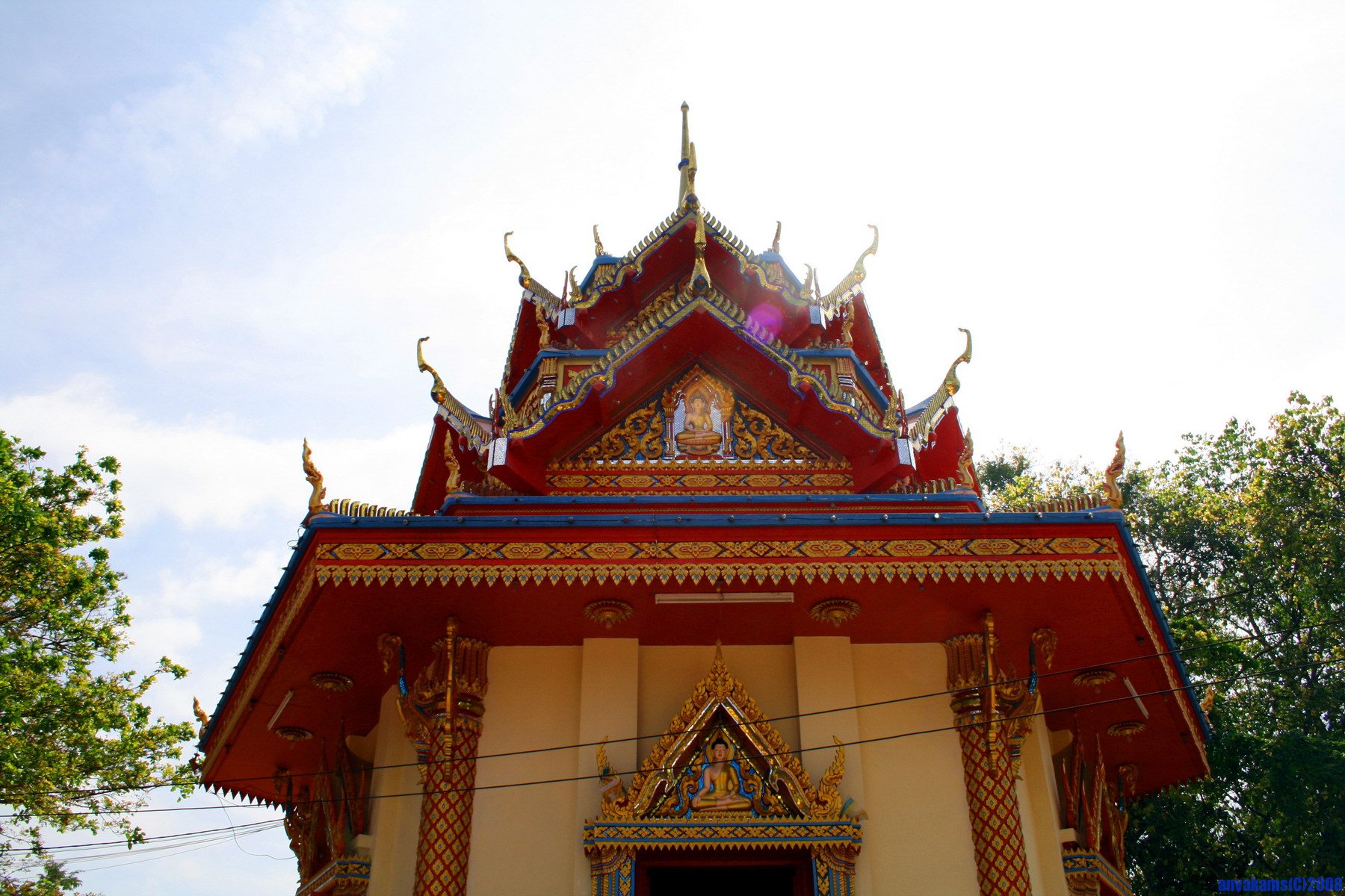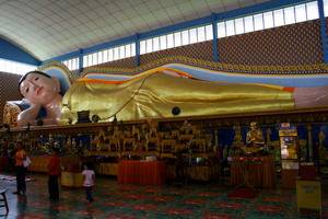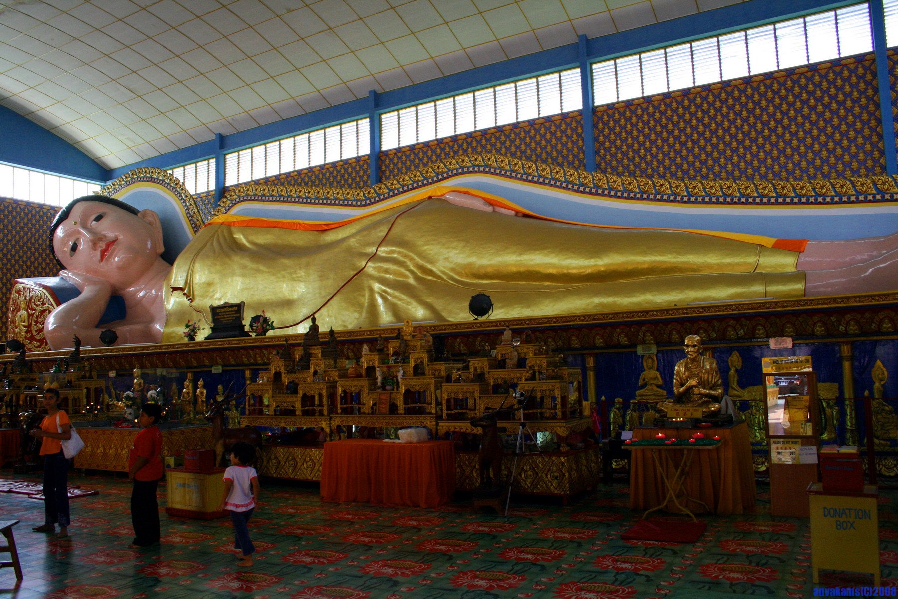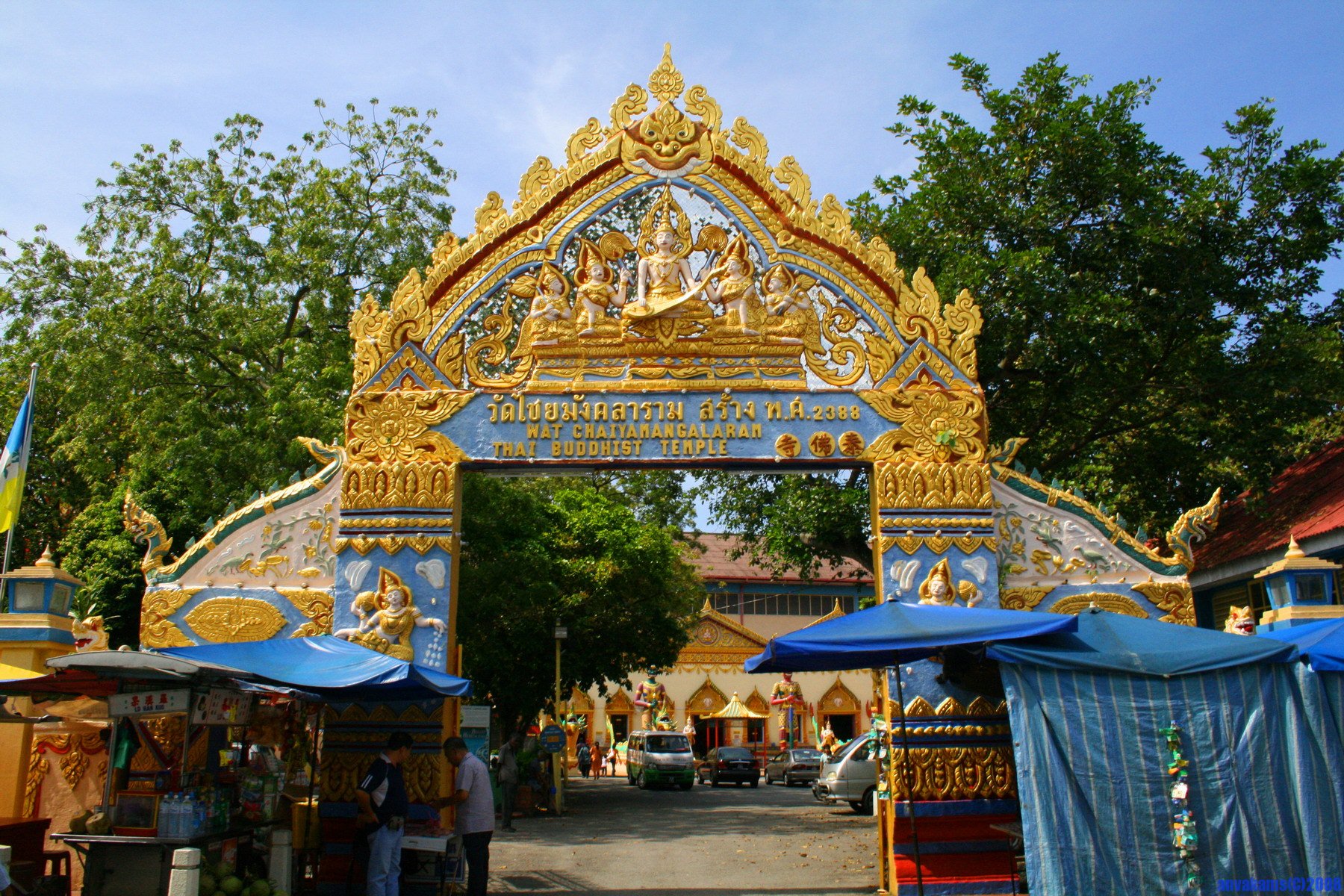 Прямо напротив этого комплекса, который, как уже понятно всем, построен бирманцами, и потому отражает видение буддизма с точки зрения бирманских жителей, находится второй не менее массивный комплекс — уже тайский. Это тайский храм спящего Будды Wat Chaiyamangalaram Thai Buddhist Temple. У него здания не такие величественные, однако основной зал скрывает уникальное сооружение — одного из самых больших в мире лежащих Будд.