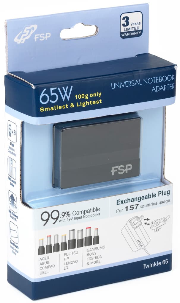 Различного рода источники питания производства FSP Group нередко попадают в нашу тестовую лабораторию: мы уже исследовали и мобильные аккумуляторы, и автоинверторы, и универсальные блоки питания для разных нагрузок — от телефонов и смартфонов до ноутбуков. Все они отличаются достаточно компактными размерами, но сейчас нам достался образец, в котором компания превзошла сама себя: адаптер Twinkle 65 размером меньше пачки сигарет, который весит чуть более 100 граммов, однако предназначен для питания ноутбуков с потребляемой мощностью до 65 Вт.