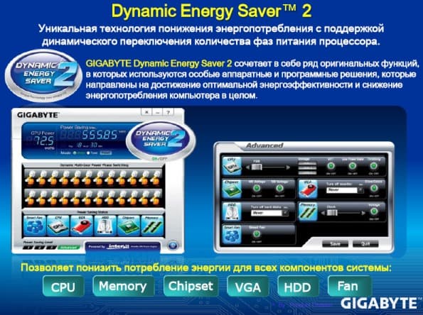 Изменениям подверглась и система электропитания центрального процессора. В новых материнских платах Gigabyte установлен 24-канальный модуль регуляции напряжения, управляемый при помощи утилиты Dynamic Energy Saver 2. Пользователям программно доступна шестиступенчатая система переключения фаз питания процессора, а также выбор встроенных профилей энергообеспечения оперативной памяти, чипсета, видеоподсистемы, жесткого диска и вентиляторов системы охлаждения.