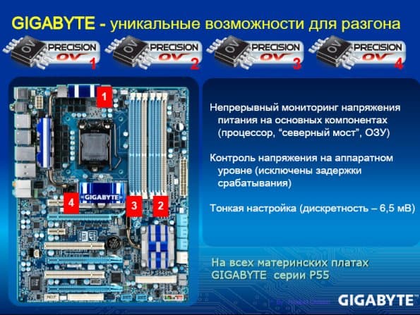 Помимо этого, для оверклокинга во всех материнских платах Gigabyte на чипсете P55 установлены IC-микросхемы для контроля и тонкой настройки напряжения модулей оперативной памяти, процессора и северного моста. На них основана технология Precision OV, позволяющая регулировать напряжение в режиме реального времени с минимальным шагом 6,5 мВ.