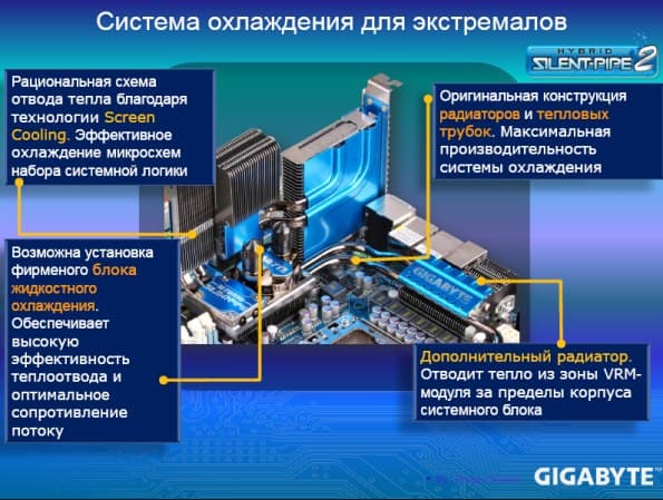 Gigabyte представила и новую комбинированную систему воздушного и водяного охлаждения Hybrid Silent-Pipe 2. В набортной системе охлаждения, представляющей собой несколько радиаторов, соединенных тепловыми трубками, выделяется один с парой патрубков, к которым можно быстро подключить систему водяного охлаждения (СВО). Стоит отметить, что водяное охлаждение в комплект поставки не входит.