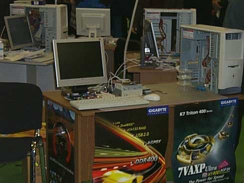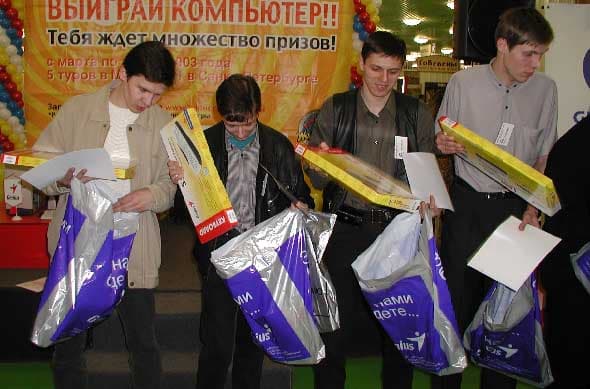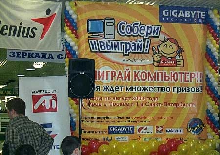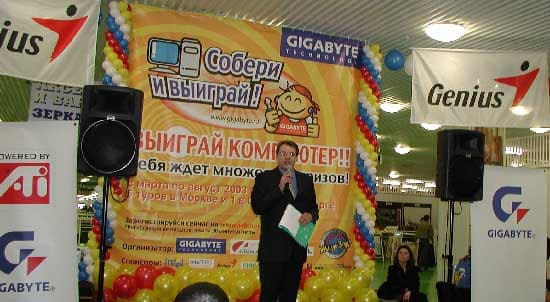 Ведущий задает какие-либо задания и если вы правильно выполняете их, вам вручается приз от спонсоров Gigabyte, Genius, IntelPro или Kingmax. Надо сказать, что вопросы подготовлены довольно каверзные, о компаниях-спонсорах и просто о компьютерной тематике. Помимо вопросов есть еще масса увлекательных конкурсов, которые помогают скоротать время, пока участники собирают компьютер на время. Естественно, чем сложнее задание, тем более интересный приз вы получаете.