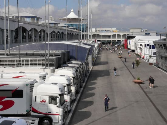 Сам комплекс находится на склоне холма, это видно на фотографиях. Насколько я понял, всего в комплексе восемь трибун плюс большое основное здание, где находятся ангары команд и VIP-зона. Во дворе здания, с обратной стороны от выезда из ангаров на трассу и напротив них, запаркованы грузовики команд, там же стоят небольшие павильончики команд.