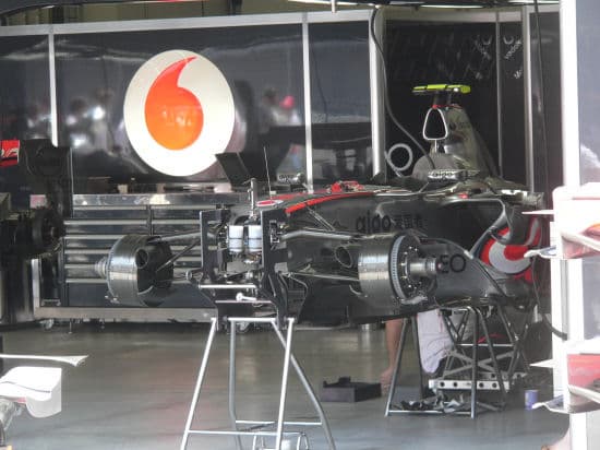 Когда мы вышли на пит-лейн, машины уже висели на специальных рамках со снятыми пластиковыми элементами кузова. Вообще, если снять обтекатели, то машина «Формулы-1» представляет собой довольно небольших размеров каркас и вовсе не выглядит грозно.