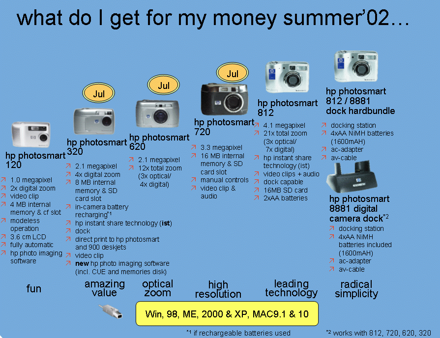 Не меньший интерес представляет другое направление компании HP — цифровые фотокамеры. Несмотря на то, что в нашей стране наибольшей популярностью пользуются продукты компаний Olympus, Canon и Minolta, фотокамеры HP все чаще стали встречаться на прилавках не только крупных и дорогих магазинов, но также и в средней рознице. В HP осознают важность рынка недорогих одна- и двухмегапиксельных камер, и этим летом планируют предложить покупателям достаточно удачные по соотношению цена/качество устройства.