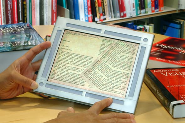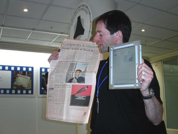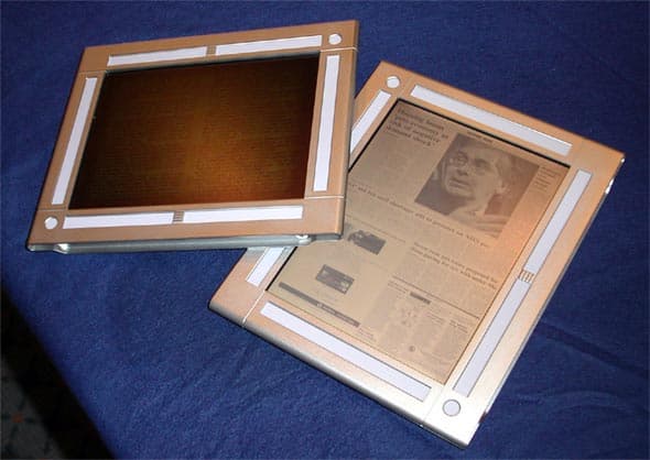 Другой не менее интересный продукт — прототип электронных книг и газет. Лично мне данная идея пришлась очень по душе. Я, например, никак не могу приспособиться к чтению книг с экрана КПК. Некоторым и вовсе приходится распечатывать данные с экрана для нормального восприятия. Если, конечно, человек не приемлет экран монитора для чтения больших обьемов информации в принипе, то тут уж ничем не поможешь, а вот первой категории людей, которым просто не нравится малюсенький экран наладонного компьютера, еще можно помочь. В то же время читая текст «с бумаги» я осознаю, что для изготовления этой книги было загублено дерево, что идет в разрез с моими убеждениями. А, учитывая весьма плачевную ситуацию в нашей стране с переработкой вторичного сырья, эта проблема становится не такой уж и мелкой, как кажется на первый взгляд.