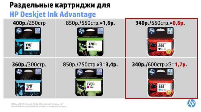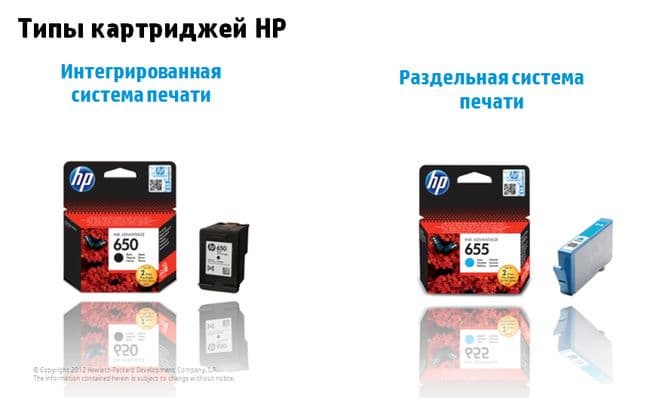 Картридж № 650 предназначен для младших моделей линейки и представляет собой интегрированную систему, т. е. все цветные чернила находятся в одном картридже. Старшие модели работают на картриджах № 655, где для каждого цвета печати используется отдельный картридж.