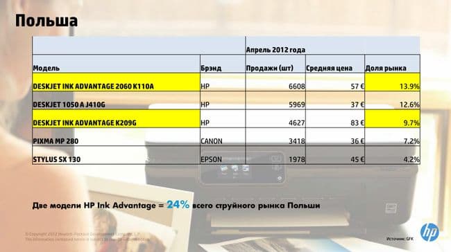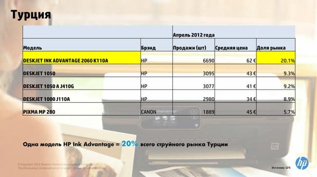 Как видите, на данный момент модели Ink Advantage лидируют по продажам, занимая существенную долю рынка. Примерно такая же ситуация и в Турции, но там сверхпопулярно одно устройство: