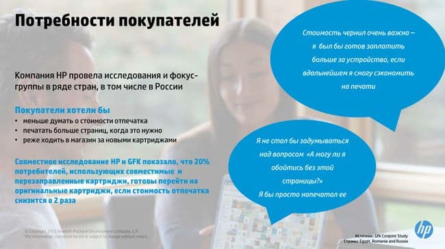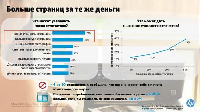По исследованию НР получается, что для большинства пользователей критическая отметка — вдвое дешевле. На мой взгляд, просто есть определенный порог стоимости, ниже которого пользователь просто перестает о ней задумываться. Условно говоря, если платишь в месяц за печать 1000 рублей, то начинаешь экономить и печатать меньше. Если же сумма в месяц при том же объеме выходит 50 руб. в месяц, а при вдвое больших объемах 100 руб, то этот вопрос просто перестанет пользователя волновать. Также совершенно правильно отражено желание реже ходить в магазин за новыми картриджами. Речь тут не об «оптовых закупках», а скорее о том, что пользователь хочет, чтобы у него не болела голова и ситуации, когда он хочет что-то напечатать, а кончились чернила случались как можно реже.