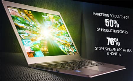Сейчас компьютеры распространены повсеместно, это уже не диковинная вещица, а обыденное устройство, помогающее в работе и в быту. Но компьютеры без приложений будут просто грудой бесполезного дорогостоящего оборудования. Вот о тяжелой доле разработчиков приложений и пошла речь на сцене. Рене привела данные со ссылкой на Vision Mobile, на основании которых складывается довольно грустная картина. В среднем разработчик мобильных приложений зарабатывает на продажах результатов своего труда $1200-3900 в месяц, при этом 33% приложений, продающихся на рынке, приносят своим создателям в среднем $100-500 в месяц, а еще 63% — менее $5000 в месяц.