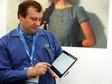 Итак, чтобы обеспечить взаимосвязанность компьютерных устройств, по мнению Intel, необходимо учесть три ключевых компонента. Это кроссплатформенный язык программирования высокого уровня, гибкое взаимодействие с облаками и гарантированная безопасность работы всего этого вместе. Все три компонента есть в HTML5. Таким образом, Intel, как и многие другие лидеры индустрии, делает ставку на HTML5 и поддерживает его. Сейчас уже порядка 40% разработчиков выбрали для себя в качестве платформы именно HTML5, а еще 40% планируют переход на HTML5 в ближайшем будущем. В качестве примера приложения, созданного с помощью HTML5, на сцене продемонстрировали обучающую программу для изучения китайского языка.