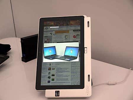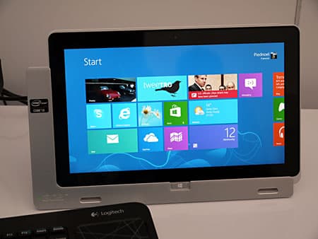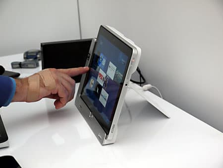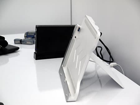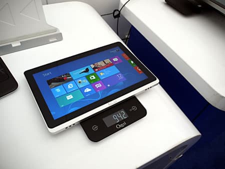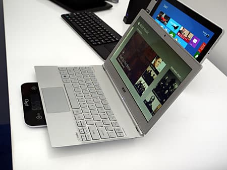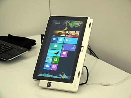 Затем показали очень интересный планшет Acer Iconia W700 на базе Core i3. Экран 11,6″, IPS-матрица, разрешение 1920×1080, масса 942 грамма, в комплекте поставляется док-станция, выполняющая роль подставки, с возможностью установки как в портретном, так и в альбомном положении. Подключается планшет к доку через интерфейс USB 3.0.