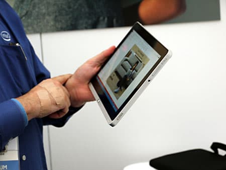 На практике работу такого датчика показали в паре с планшетом Samsung, на фото датчик (прототип) виден в виде прямоугольной коробочки, прикрепленной с правого края планшета. В законченных продуктах датчик можно будет просто интегрировать в корпус планшета.