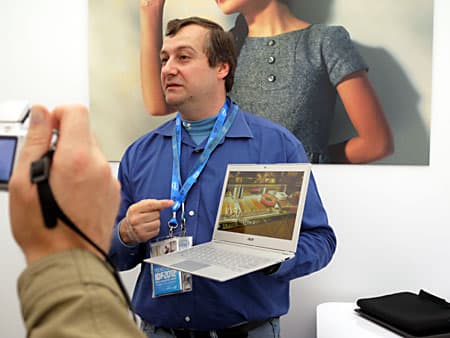 Зато показали ультрабук Acer Aspire S7, корпус которого выполнен из композитного материала, экран 11″, IPS-матрица, разрешение 1336×768, толщина корпуса 12 мм, масса всего 996 г; в режиме серфинга по интернету он должен жить от батареи до 7 часов (хотя это, скорее всего, не так), в режиме просмотра видео — существенно меньше, в зависимости от типа проигрываемого видео (если видео в H.264, то за счет аппаратного декодирования расход емкости аккумулятора будет меньше, чем, например, при проигрывании DivX).