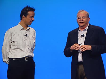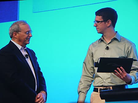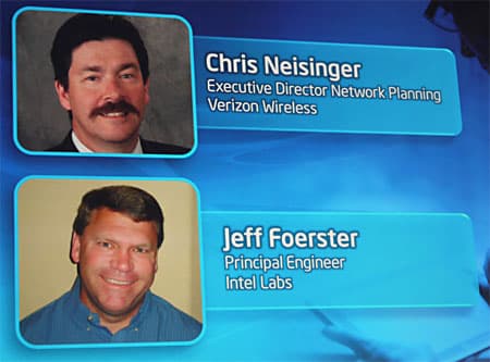 На сцену вышли Chris Neisinger (Крис Нейсингер), исполнительный директор, отвечающий за развитие сетевой инфраструктуры Verizon Wireless, и Jeff Foerster (Джеф Фоэрстер), ведущий инженер Intel Labs.