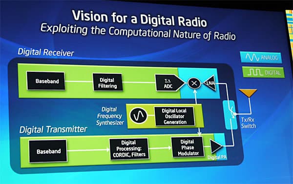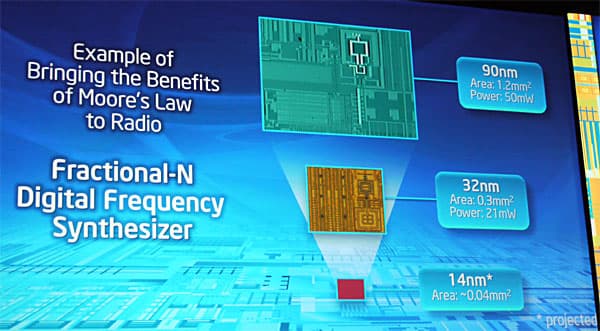 В случае с радиоприемником нужно было разработать сигма-дельта АЦП и цифровой синтезатор частоты, а для радиопередатчика нужно было создать цифровой усилитель мощности для радиочастот и цифровой фазовый модулятор. Реализация описанных цифровых модулей позволила наглядно показать, что́ такой подход дает на практике. По сути, перенести закон Мура на область радиомодулей. Например, ниже показано, как изменяется площадь цифрового синтезатора частот при уменьшении технологического процесса производства: