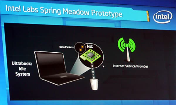 Таким образом, если отфильтровывать ненужный входящий трафик и нагружать CPU системы обработкой только необходимых данных, полученных извне, причем распределяя эту работу равномерно во времени, то получится увеличить время автономной работы. Реализовать эту идею позволяет решение Intel под кодовым именем Spring Meadow. Для практической демонстрации эффекта от применения Spring Meadow на сцене развернули демонстрационный стенд, состоящий из двух ноутбуков с беспроводным подключением и системой мониторинга различных параметров, включая загрузку CPU.