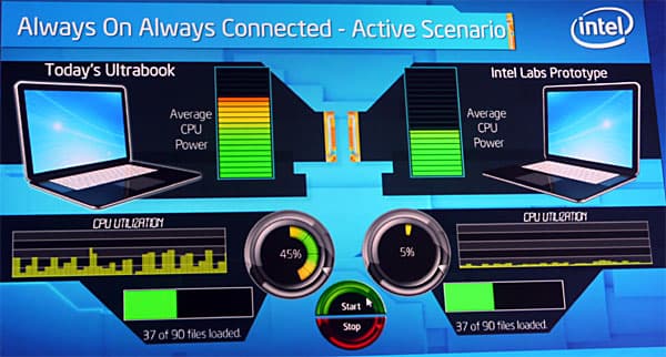 Слева отображается обычный ультрабук, а справа — с поддержкой Spring Meadow. Хорошо видно, что в режиме постоянного подключения к сети система слева постоянно нагружена, а система справа загружена дискретно, что и позволяет существенно экономить расход заряда аккумулятора.