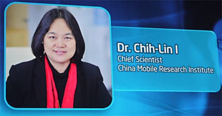 Затем тема сменилась на вопрос развития и построения сетевых инфраструктур для беспроводной связи. В рамках IDF 2011, т. е. год назад, публике была продемонстрирована базовая станция LTE, построенная на основе стандартного аппаратного обеспечения для платформы x86. Такое решение обладает неоспоримым преимуществом в плане модернизации, т. е. достаточно обновить программное обеспечение — и будет реализована поддержка новых протоколов и стандартов связи. Разработка такого подхода к созданию базовых станций для сотовых сетей ведется совместно Intel и крупнейшим оператором China Mobile. На сцену вышла доктор Чин Лин Ай, научный руководитель института исследований China Mobile.