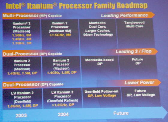 Современные DP процессоры Itanium 2, предназначенные для использования в одно- и двухпроцессорных серверах, базирующиеся на ядре Madison и имеющие тактовую частоту 1,4 ГГц и кэш L3 1,5 МБ, в 2004 году заменит DP чип, созданный на основе дизайна Montecito. Он же в свою очередь рано или поздно уступит место на рынке некому «Future DP». Как говорится, здесь все ясно и предельно лаконично. :-)