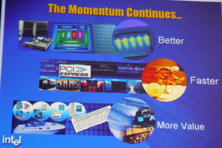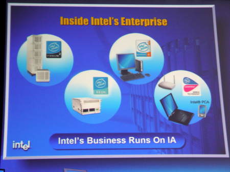 Таким образом, согласно презентации enterprise-части ключевого доклада второго дня IDF, продукция Intel в этом секторе рынка полностью соответствует вышеупомянутому девизу — «Better, faster and more valuable», как минимум, в отношении серверов и рабочих станций. Что касается ПК, то их соответствие этому лозунгу описано еще в третьей части репортажа на примере технологий LaGrande и Hyper-Threading, а также программы Intel Stable Image Program. О портативных решениях стоит поговорить позже — они заслуживают отдельного репортажа, тем более, что во второй день IDF было объявлено немало новинок сектора мобильных решений.