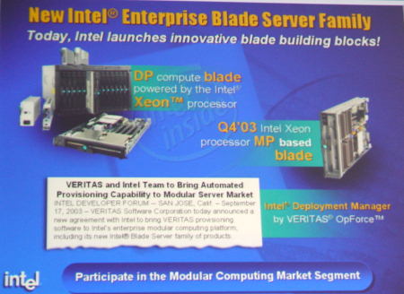 Первым такого рода продуктом стал сервер Compute Blade SBXL52, позволяющий устанавливать до четырнадцати blade-модулей с двумя Xeon DP в каждом. Обеспечивается упрощенное управление платформой и системными ресурсами при помощи ПО Intel Management Module и Intel Deployment Manager от VERITAS OpForce. Несколько позже в текущем году должны появиться четырехпроцессорные blade-серверы McCarran на базе Xeon MP.