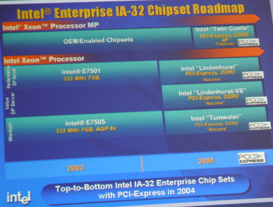 Гораздо любопытнее с точки зрения информативности выглядит роадмэп платформы Xeon. Существующий чип для многопроцессорных систем (MP) Gallatin с частотой 2,80 ГГц и кэшем L3 объемом 2 МБ в 2004 году заменит Gallatin-4M с тактовой частотой 3,0 ГГц и 4 МБ кэша L3. Появление во второй половине того же года процессора на ядре Potomac, производимого по 90-нанометровой технологии и обладающего более высокой тактовой частотой и большим объемом кэша третьего уровня произойдет одновременно с выходом на рынок предназначенного для него чипсета с кодовым именем Twin Castle. Последний будет поддерживать до четырех Xeon MP, шину PCI Express и память DDR2. Затем в будущем будет выпущен двухядерный Xeon MP под названием Tulsa.