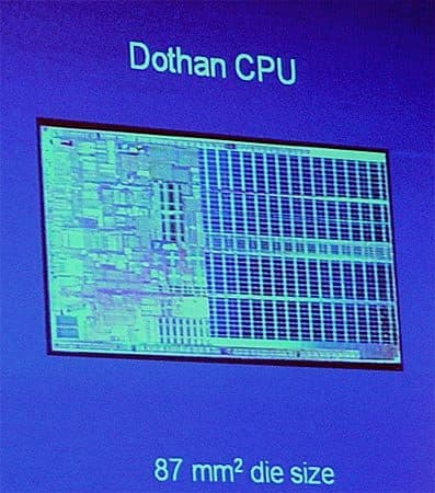 Процессор Dothan будет производиться на 300-миллиметровых пластинах по 90-нанометровой технологии с напряженным кремнием. Это даст ему преимущества по сравнению с современным 0,13-микронным Banias как по запасу тактовой частоты, так и по уровню тепловыделения. Процессор будет состоять из 140 млн. транзисторов, что рекорд не только для мобильных, но и для настольных систем. Впрочем, это число будет удивлять гораздо меньше, если учесть еще один рекордный показатель — кэш второго уровня емкостью 2 Мб. На фотографии видно, что именно под кэш и уходит изрядное число составляющих чип транзисторов. При этом площадь самого кристалла сравнительно невелика — 87 кв. мм.