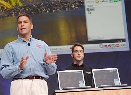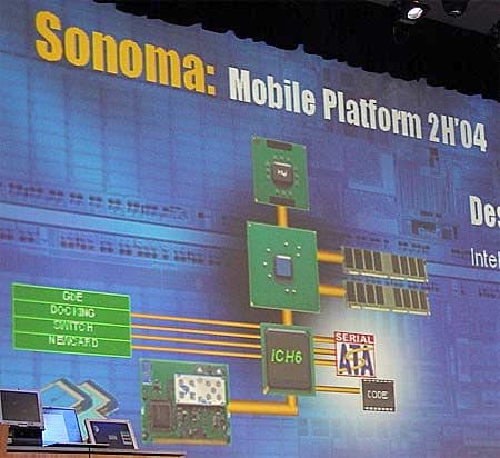 На ключевом докладе второго дня особенно сильный акцент был сделан на мобильном сегменте — официально объявили платформу Sonoma, являющуюся следующим поколением технологии Centrino, а также чипсет i855GMV.