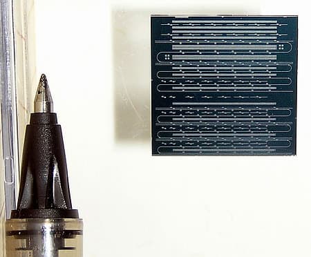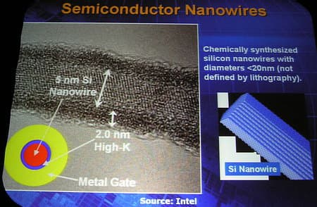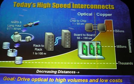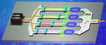 Другим интересным событием нулевого дня этого IDF стал доклад о первом в мире непрерывном лазере, созданном на кремниевом кристалле в Intel. Строго говоря, новость об этом обошла мир за несколько дней до IDF (17 февраля вышла соответствующая статья в Nature и пресс-релиз корпорации), но здесь главные разработчики нового прибора прилюдно поделились многими доселе неизвестными деталями и продемонстрировали аудитории многочисленные кристаллы с такими лазерами. Например, на этом фото (фото автора) кристалл содержит сразу 8 таких лазеров.