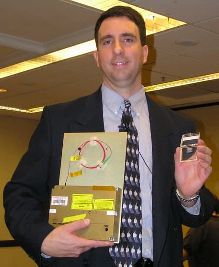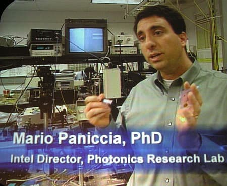 В руках у Mario Paniccia, директора Intel Photonic Technology Lab, кристалл нового непрерывного кремниевого лазера (справа) и традиционный дорогой рамановский оптический усилитель (слева):