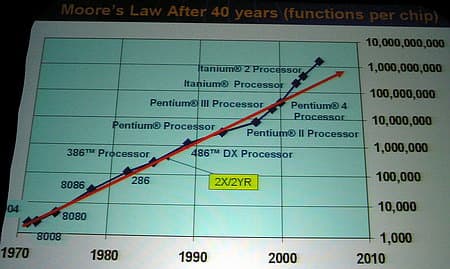 Последние 40 лет число элементов на кремниевых кристаллах неуклонно продолжало удваиваться каждые два года, а стоимость одного транзистора на кристалле теми же темпами снижалась.