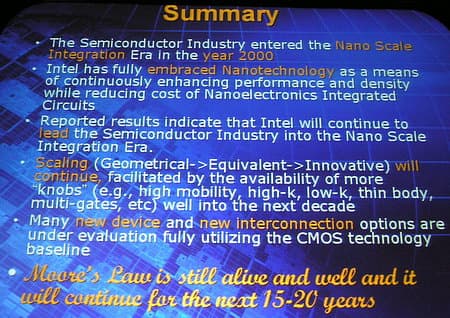 В первом докладе нулевого дня речь пошла о том, какими путями может и будет развиваться кремниевая технология производства вычислительных устройств в ближайшие десятилетия. Кратко и примитивно это можно было бы назвать «оправданием закона Мура на 20 лет вперед», если бы такой банальный на первый взгляд посыл не был подкреплен захватывающими дух деталями научных исследований в области нанотехнологий и их воплощением на практике в технологии промышленного масштаба. Доклад представил Пауло Джарджини (Paulo Gargini, на фото), директор Intel Technology Strategy и Intel Nanotechnology Research.