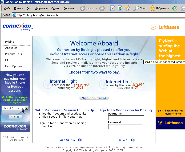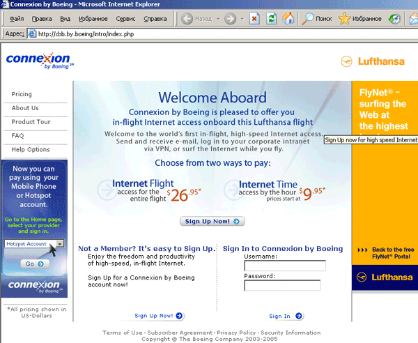 Дело оказалось за малым — легким движением руки включаем ноутбук на Intel Centrino, и в доли минуты, не меняя каких-либо настроек (то есть в полностью автоматическом режиме), подключаемся к беспроводной точке доступа! После установления соединения кликаем по браузеру и попадаем на web-страничку Lufthansa FlyNet: