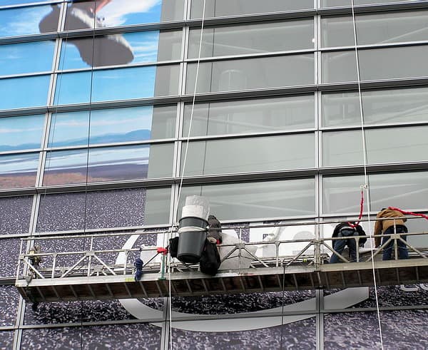 а на одной из внешних стен здания монтируют здоровенный транспарант,