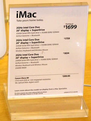 Так вот, заглянув мимоходом в ближайший магазин компании Apple, я увидел, что модели компьютеров на процессорах Intel уже вовсю теснят «прежнего фаворита» на процессорах линейки PowerPC Gx: на экспозиции в торговом зале систем с процессорами Intel уже больше половины (или около половины). Народ их активно «пробует», да и как пройти мимо, если ему обещают вдвое возросшую производительность,