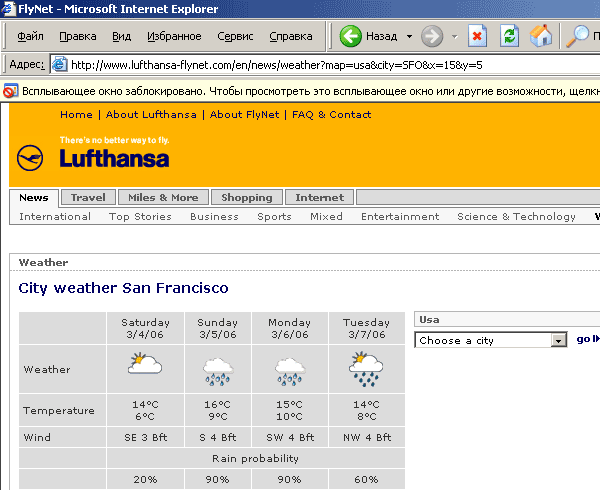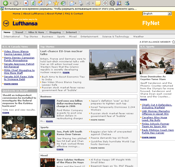 Здесь у счастливого пользователя, рассекающего заоблачные высоты на крейсерской скорости около тысячи км в час, появляется выбор. Во-первых, можно совершенно бесплатно (то есть for free) попользоваться информационным порталом FlyNet, на котором собрана самая разнообразная свежая информация — от последних новостей в политике и деловом мире и статей на злободневные темы до спорта, погоды и путешествий.