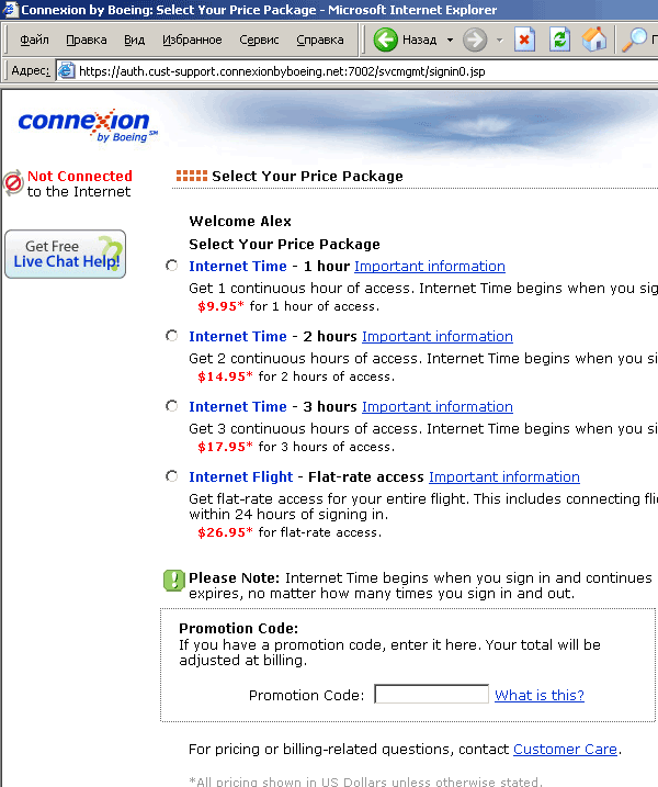 Беспроводное подключение к Интернет в полете осуществляется службой (компанией) Connexion by Boeing, и предлагаемые ею тарифы нельзя назвать низкими. Например, во время описываемого здесь полета они были такими: