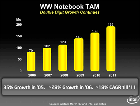 За грядущие 5 лет количество ежегодно продаваемых ноутбуков возрастет вдвое. Это около 18% в год (в 2005 г. было 35%, в 2006 было 28%). Касательно Китая это будет также многомиллионная цифра, причем основная их доля приходится на сегменты SMB и Home.