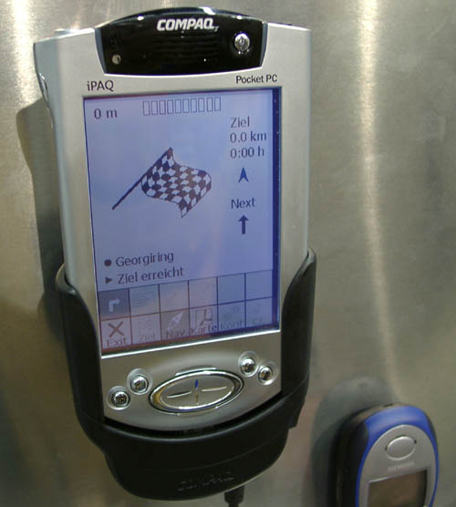 Более интересно было программное обеспечение для КПК, с его помощью пользователь может ориентироваться в незнакомой местности, карта показывает небольшой участок местности, и говорит когда нужно поворачивать, сколько проехать и т.д. При этом сами карты на КПК не хранятся, они каждый раз загружаются с сервера провайдера, но так как они весьма невысокого разрешения, то это удобно. Ранее этот сервис был реализован с помощью SMS сообщений, в одно сообщение разработчики умудрялись вместить около 5 кварталов городской застройки, стоимость участка карты (не зависимо от числа сообщений) составляла около 1 евро. Сейчас пересылка данных осуществляется с помощью пакетной передачи данных, любопытно, что на стенде был подключен к КПК Siemens C45, не поддерживающий эту функцию, менеджер объяснил, что это просто демонстрация того, что система работает с телефонами.