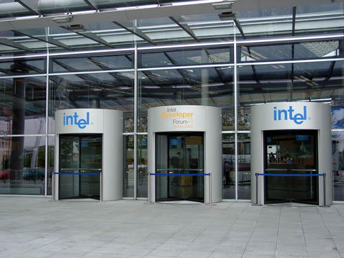 Подъезды к зданию, в котором проходит форум, увешаны флагами Intel, как ни странно, но та же символика наблюдается и внутри здания.