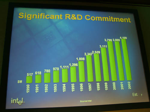 Интересные данные были приведены в выступлении, вы можете сами увидеть, сколько средств Intel вкладывает в разработки и исследования, причем особо было подчеркнуто, что это вложения не в сиюминутные продукты, а в технологии, которые начнут приносить отдачу через много лет, если вообще такая отдача будет.