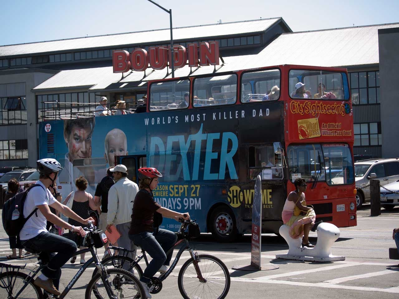 К сожалению, в Сан-Франциско из-за океана регулярны туманы, и увидеть Golden Gate Bridge во всей красе удается не всегда. Нам не повезло, был плотный туман. Зато встретился автобус с рекламой нового сезона Dexter с Майклом Холом в главной роли. Кстати, если кто-то не смотрел еще данный сериал, но при этом любит хорошие детективы, стоит потратить время, но не судите по первой серии. Посмотрите хотя бы первые три.