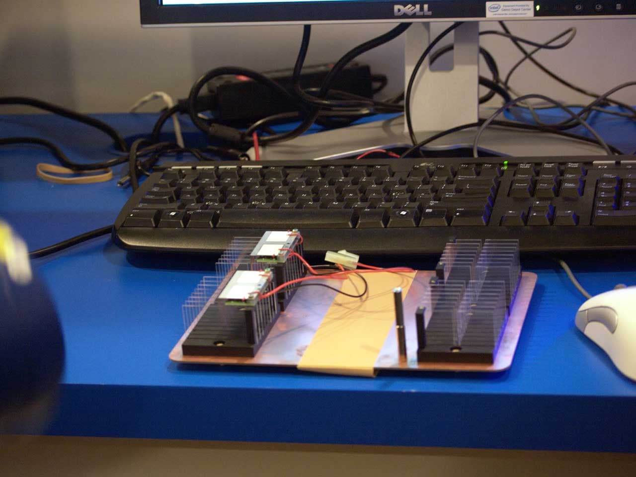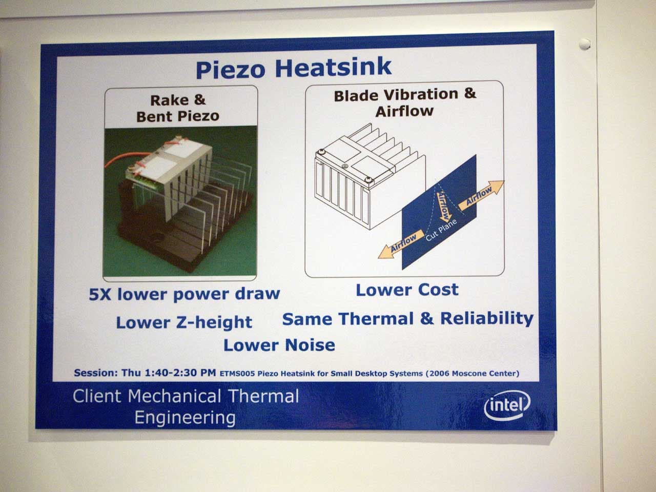 На форуме Intel для разработчиков особое внимание привлекла к себе новая технология охлаждения, объединяющая достоинства традиционных систем охлаждения процессоров и пьезоэлектрической технологии. Новая технология ориентирована на маломощные в плане тепловыделения системы (до 20 Вт рассеиваемого тепла, например на процессоры Atom), но требовательные к габаритам систем охлаждения. Пьезокулер устроен так: над требующим охлаждения чипом размещается пьезоэлектрический элемент, представляющий собой вибрирующую (колеблющуюся) с высокой частотой пластину. Эти движения пластины и создают воздушный поток, который и отводит тепло. На глаз отдельные колебания не заметны, точнее видно нечто размазанное из-за высокой частоты колебаний, зато если направить на такой пьезокулер луч стробоскопа, можно убедиться, что пластина совершает более 5700 колебаний в минуту.