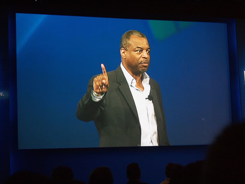 Выступление Эрика Кима (Eric Kim), старшего вице-президент и генерального директора Intel Digital Home Group, началось с того, что он вместе с актером LeVar Burton (Левар Бёртон, вы могли видеть его в фильмах вселеной StarTrek) сидят на диванчике и видят на экране красивое меню, листают его в поисках чтобы такого посмотреть. Потом выбрали фильм к просмотру — одна из серий «Чисел», но решили его посмотреть позже и запустили его запись на жесткий диск. В итоге для просмотра прямо сейчас был выбран один из эпизодов StarTrek. При этом в плеере фоновый рисунок сменился на вид капитанского мостика «Вояджера». Во время просмотра фильма им позвонил друг по видеосвязи — Джастин Раттнер и попросился посмотреть кино вместе с ними, после недолгих раздумий его подключили и он присоединился к просмотру, по сетевому соединению. После этого с диванчика встал мистер Бёртон и поделился с аудиторией своим видением на тему того, что только смелые фантазии и вера в то, что возможно всё, двигают прогресс вперед.
