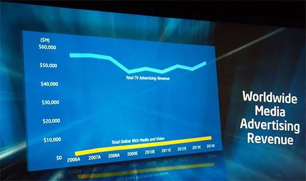 Затем Эрик Ким перешел к теме бизнес модели и речь пошла о том, что можно предоставлять контент бесплатно, а зарабатывать на рекламе, как это обычно происходит на телевидении. При этом ёмкость рекламного рынка в сетях доставки видео по запросу — огромна.